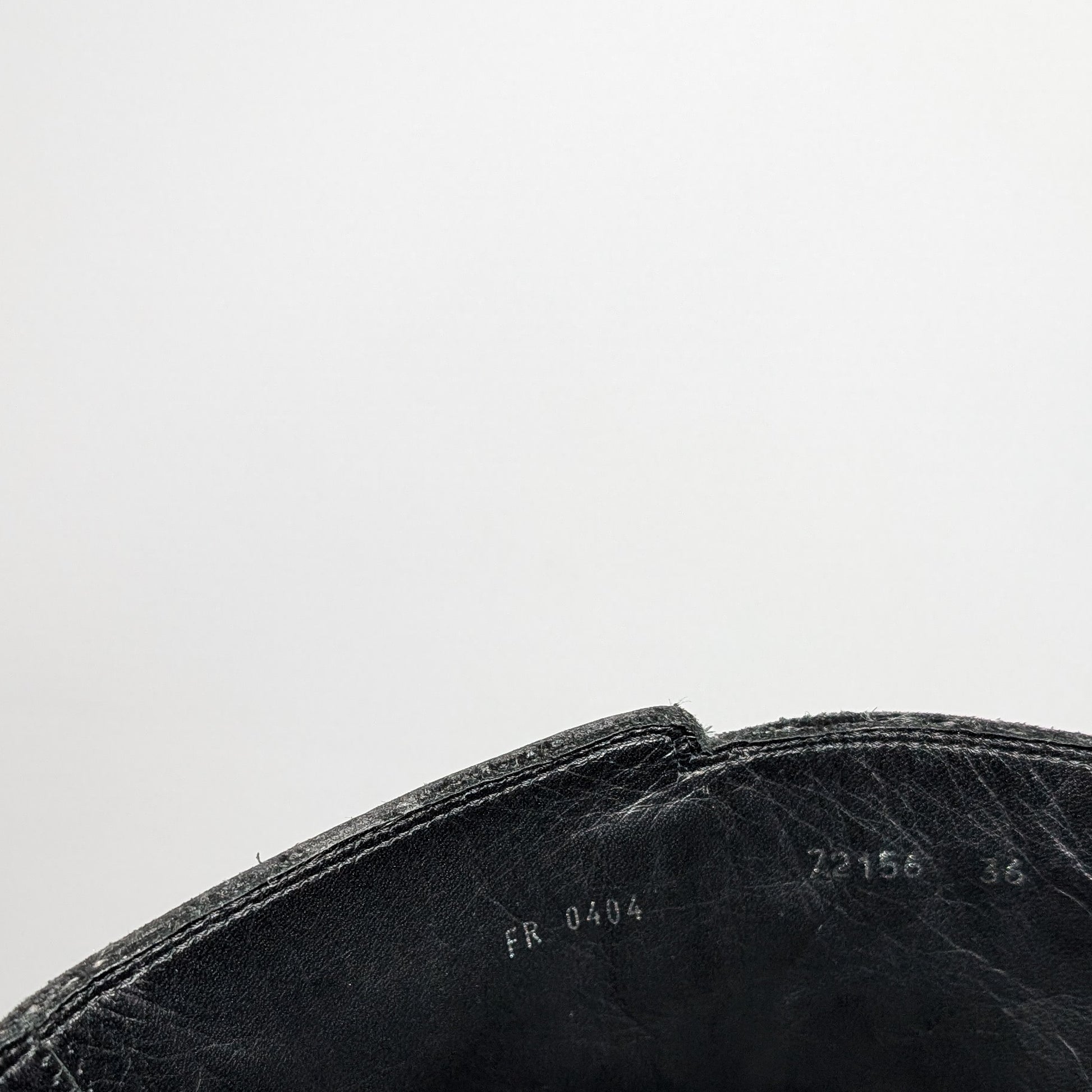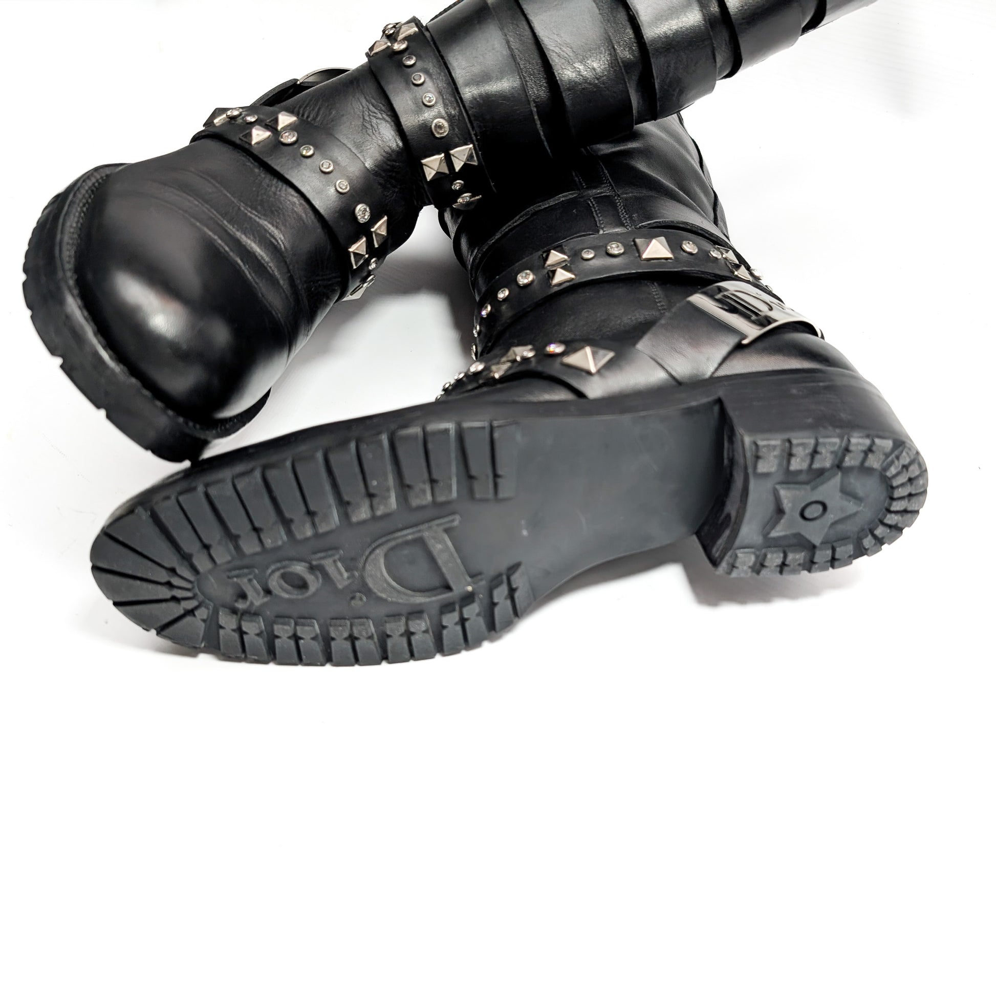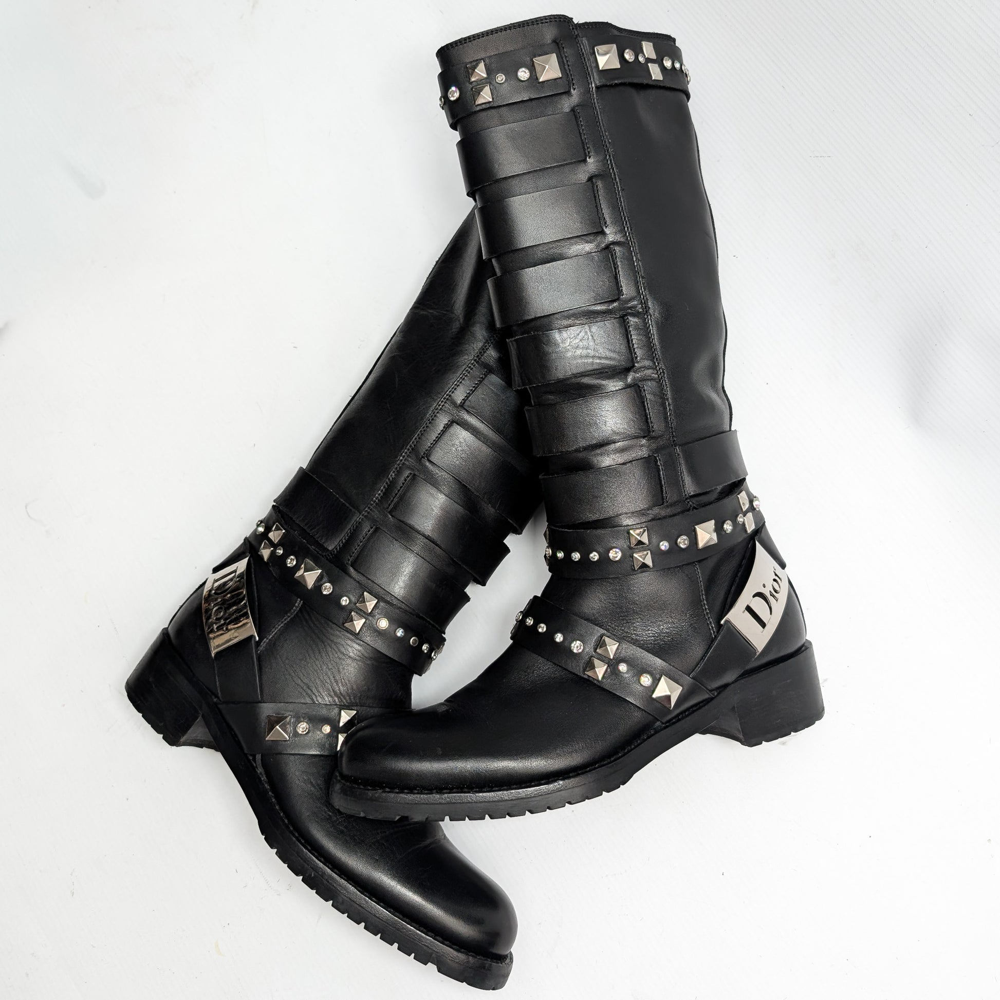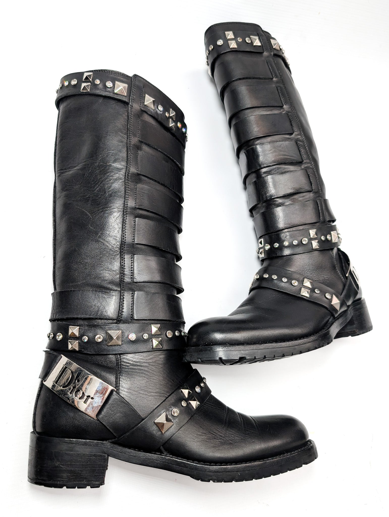 Item: Motorcycle-style leather boots. Silver plate marked "Dior" on each boot.