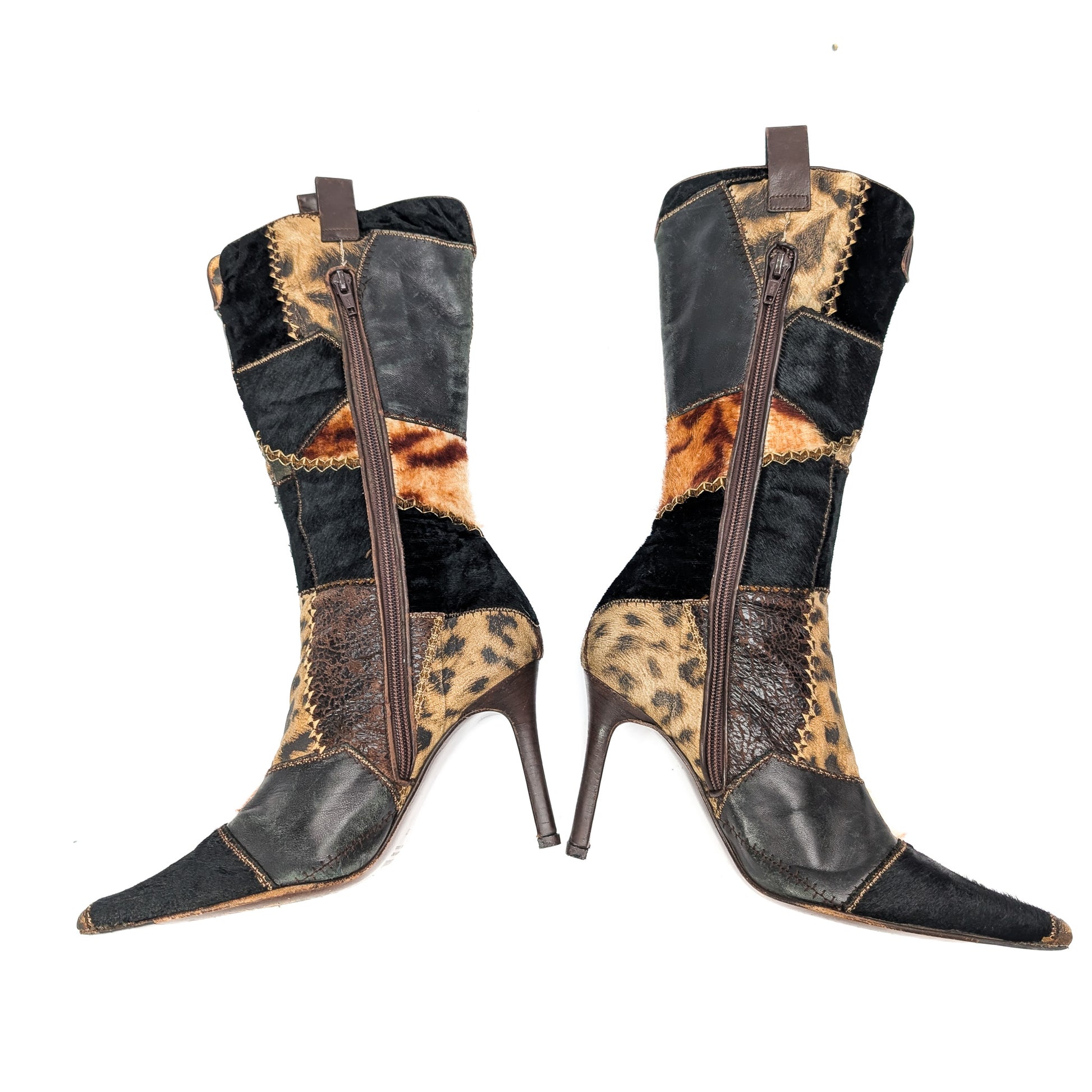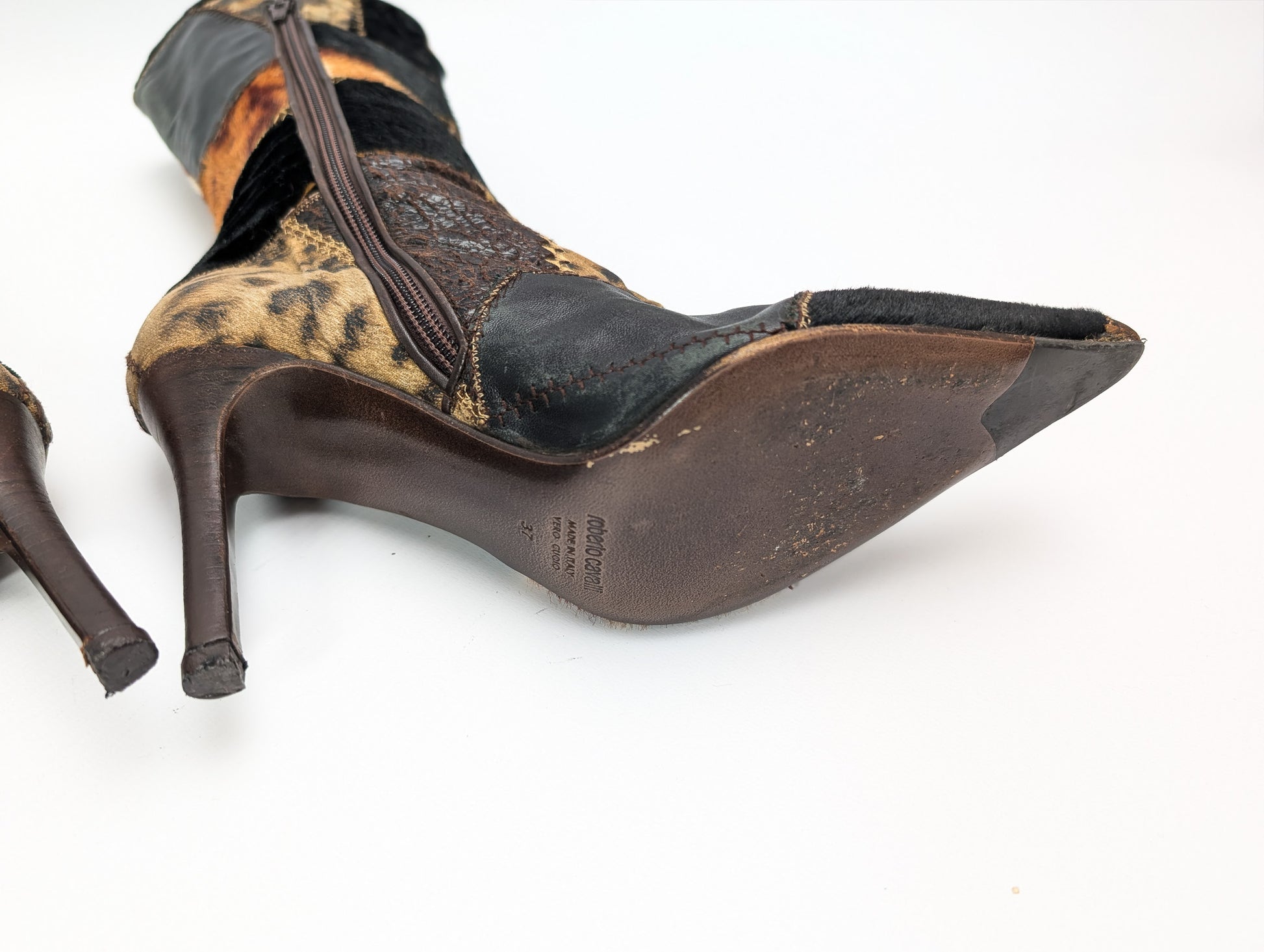 Item: Roberto Cavalli leather boots. Fur patchwork pattern. Inner zipper for easy on and off.