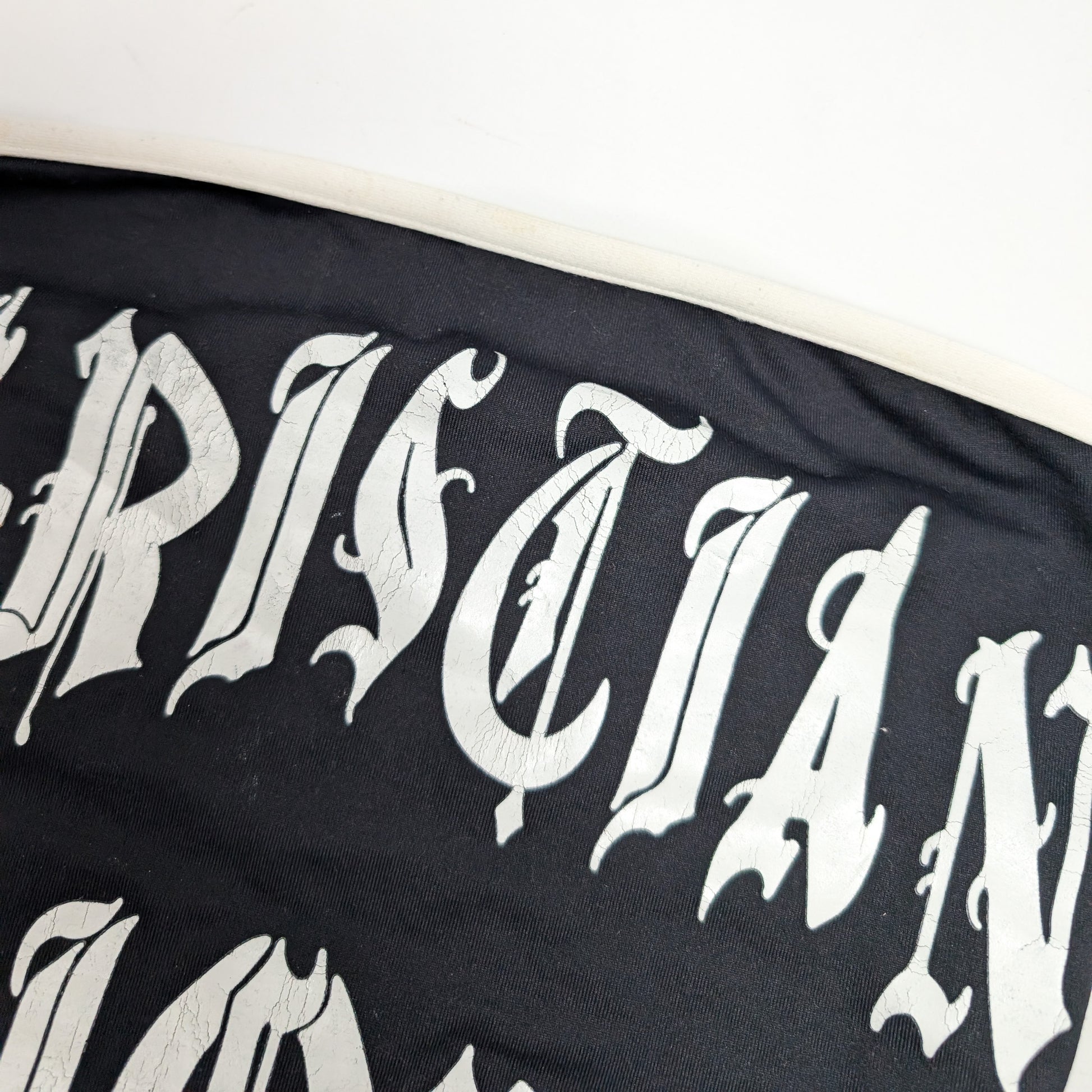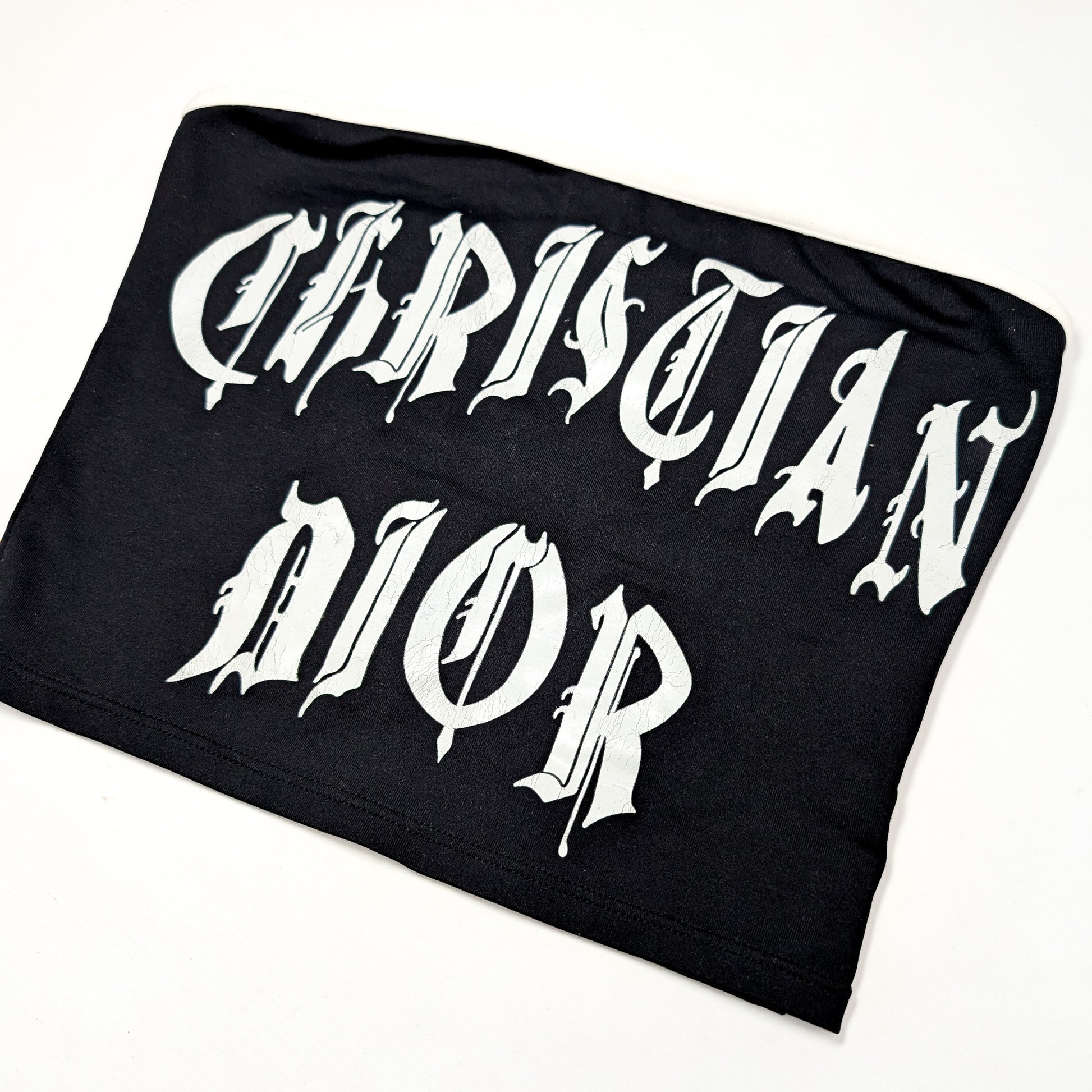 Item: Black bustier adorned with a gothic-style inscription "Christian".