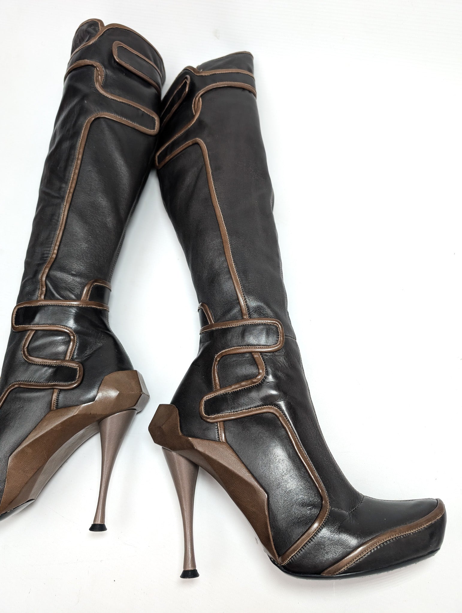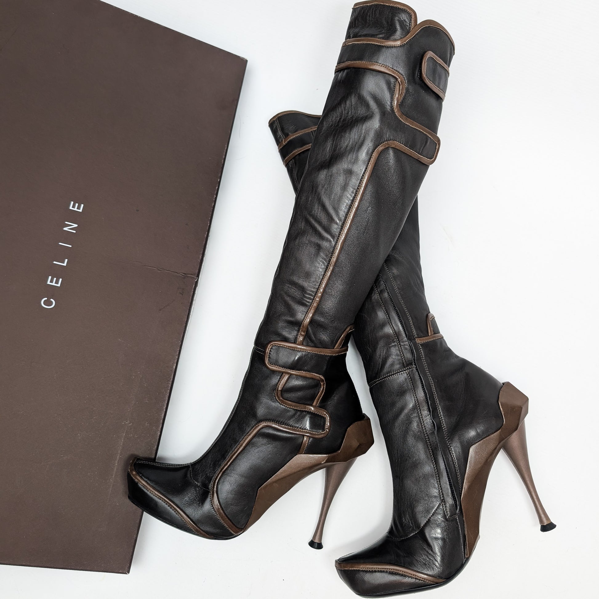 Item: Celine high boots with straps. A key piece from the Celine Autumn/Winter 2008 runway show. Soft leather. Brown shade.