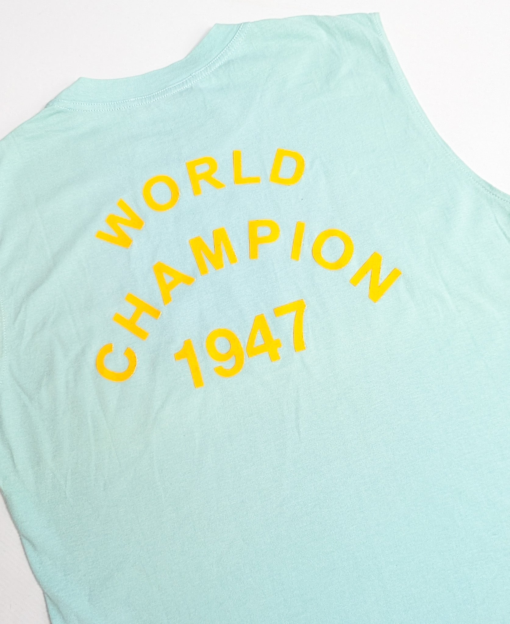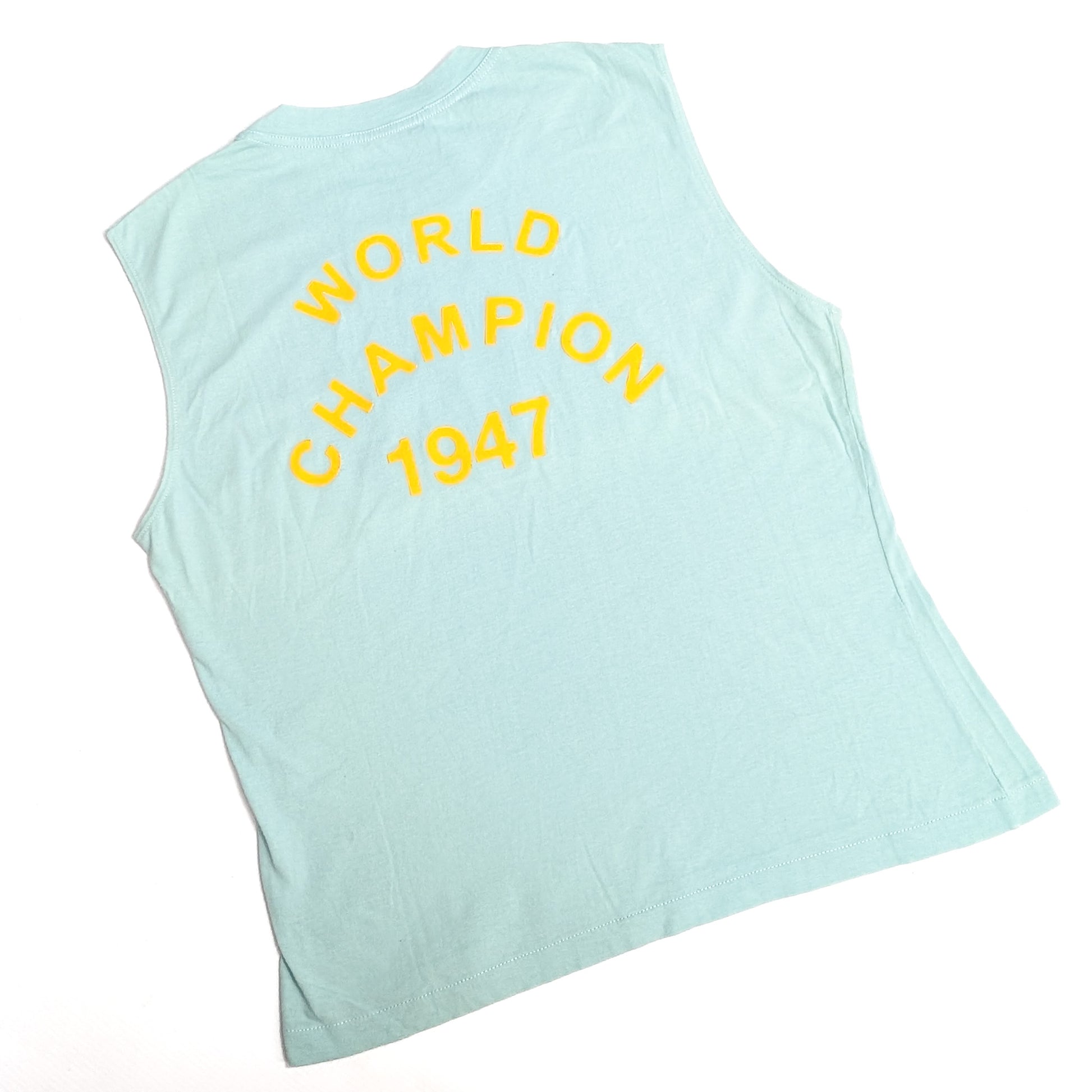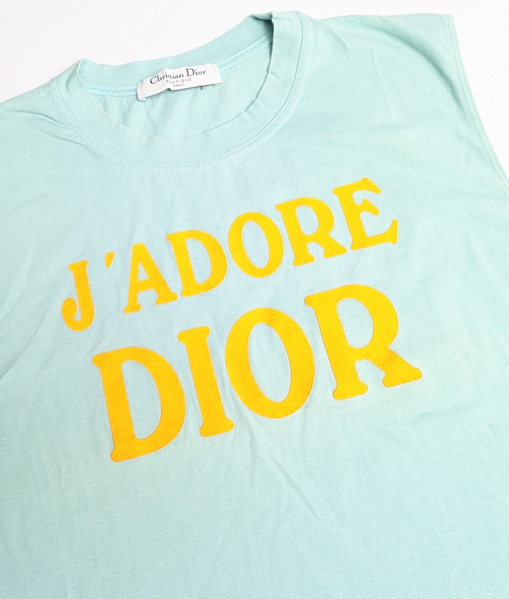 Item: Round-neck tank top featuring a yellow "J'adore Dior" inscription on the front and " World Champion 1947" on the back, on a light powder blue solid background. Very rare color.