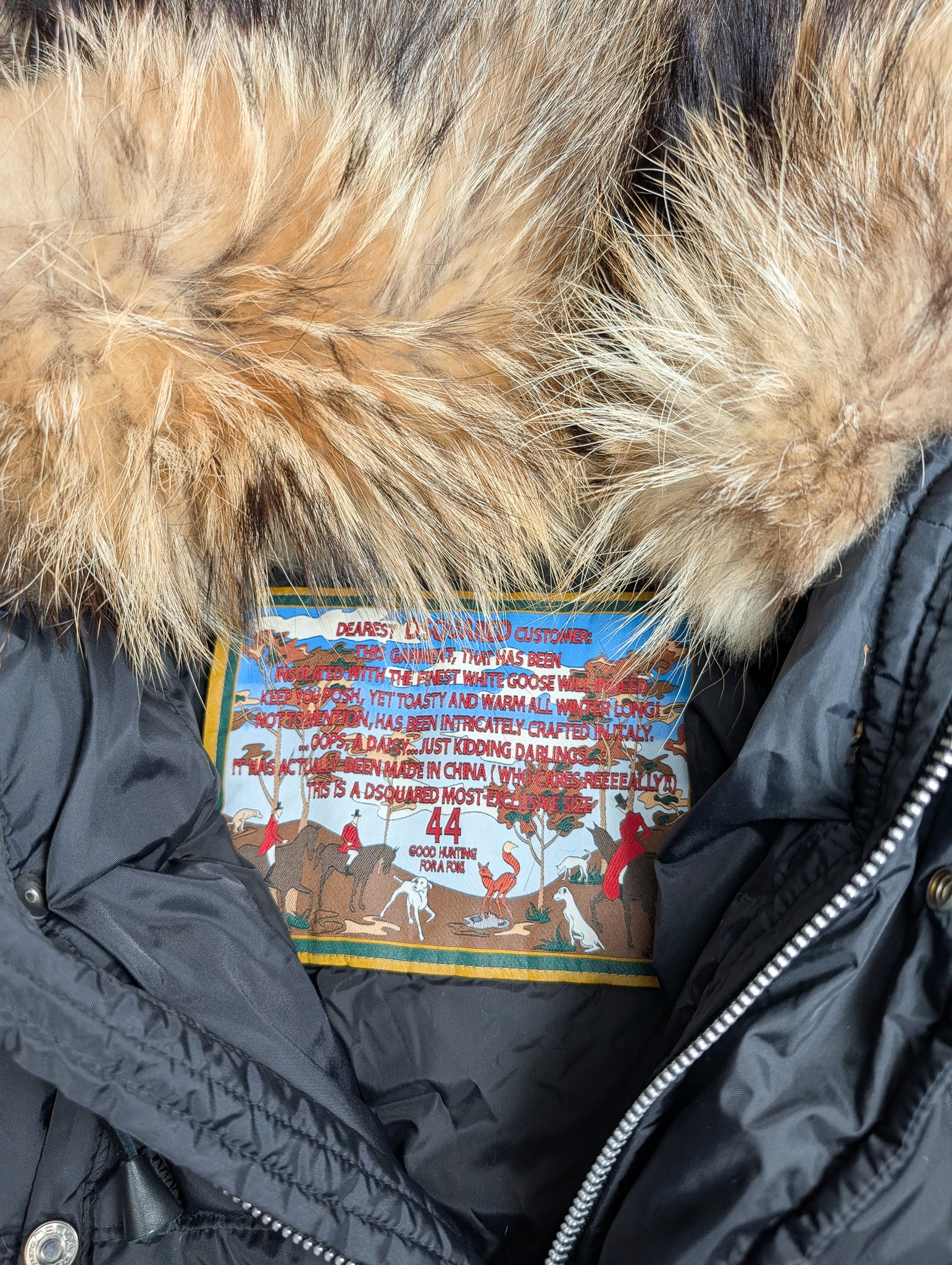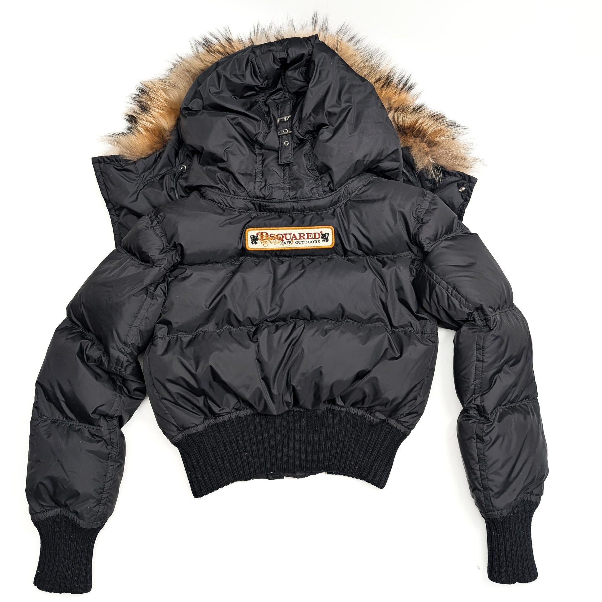 Item: Short, very warm down jacket with real fur, removable collar and hood. Fur collar and fur-trimmed hood.