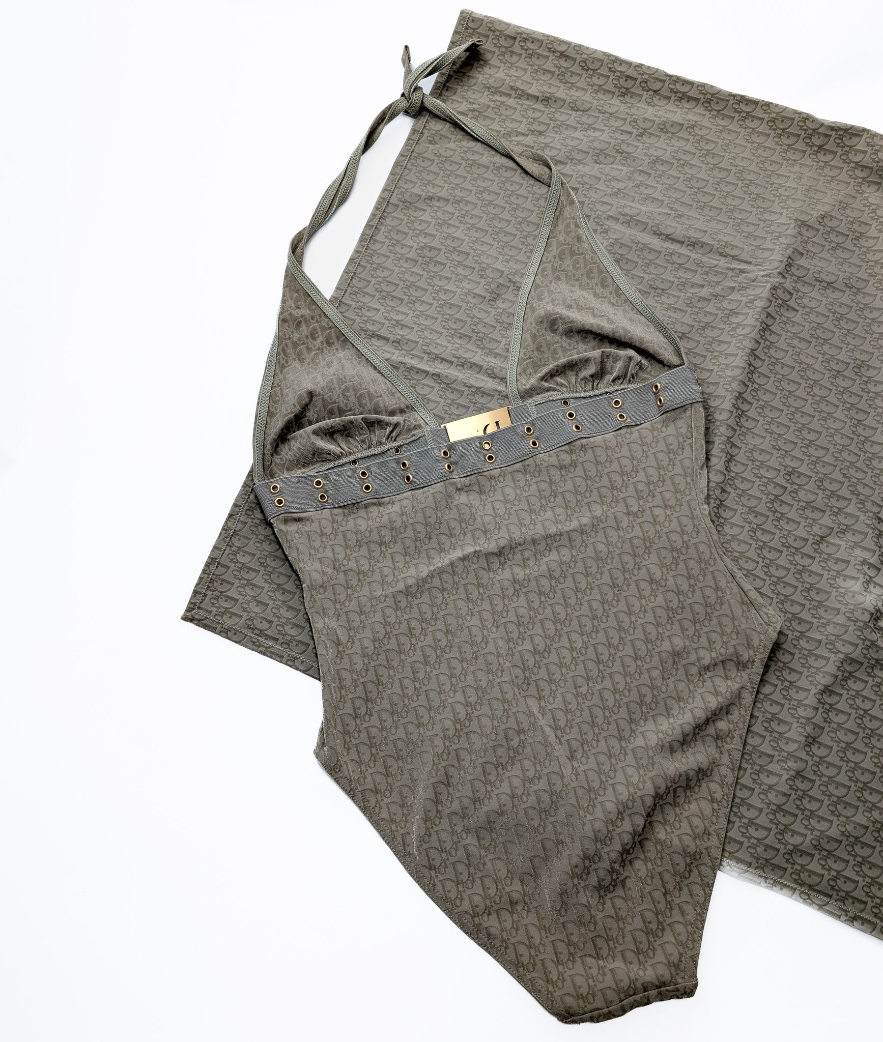 Item : Swimsuit adorned with a plaque signed "Dior" and large Dior pareo by Galliano. Monogram pattern in khaki green.