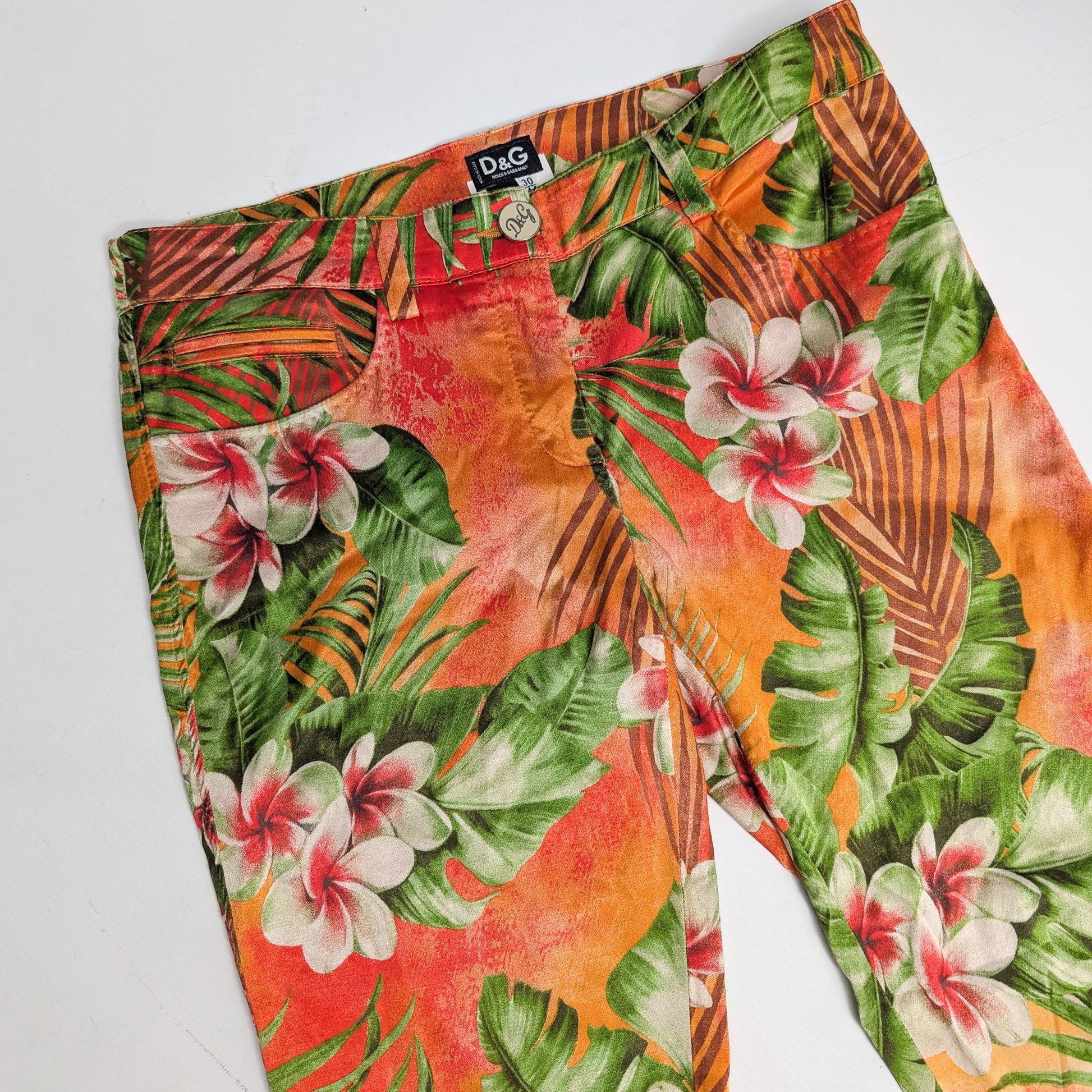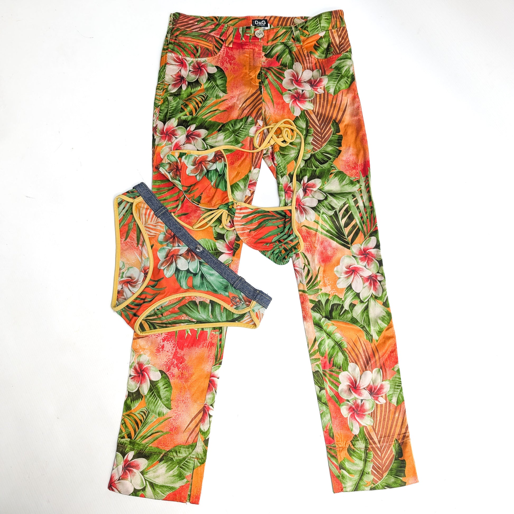 Item: Pants and Two-piece swimsuit with a multicoloured print.