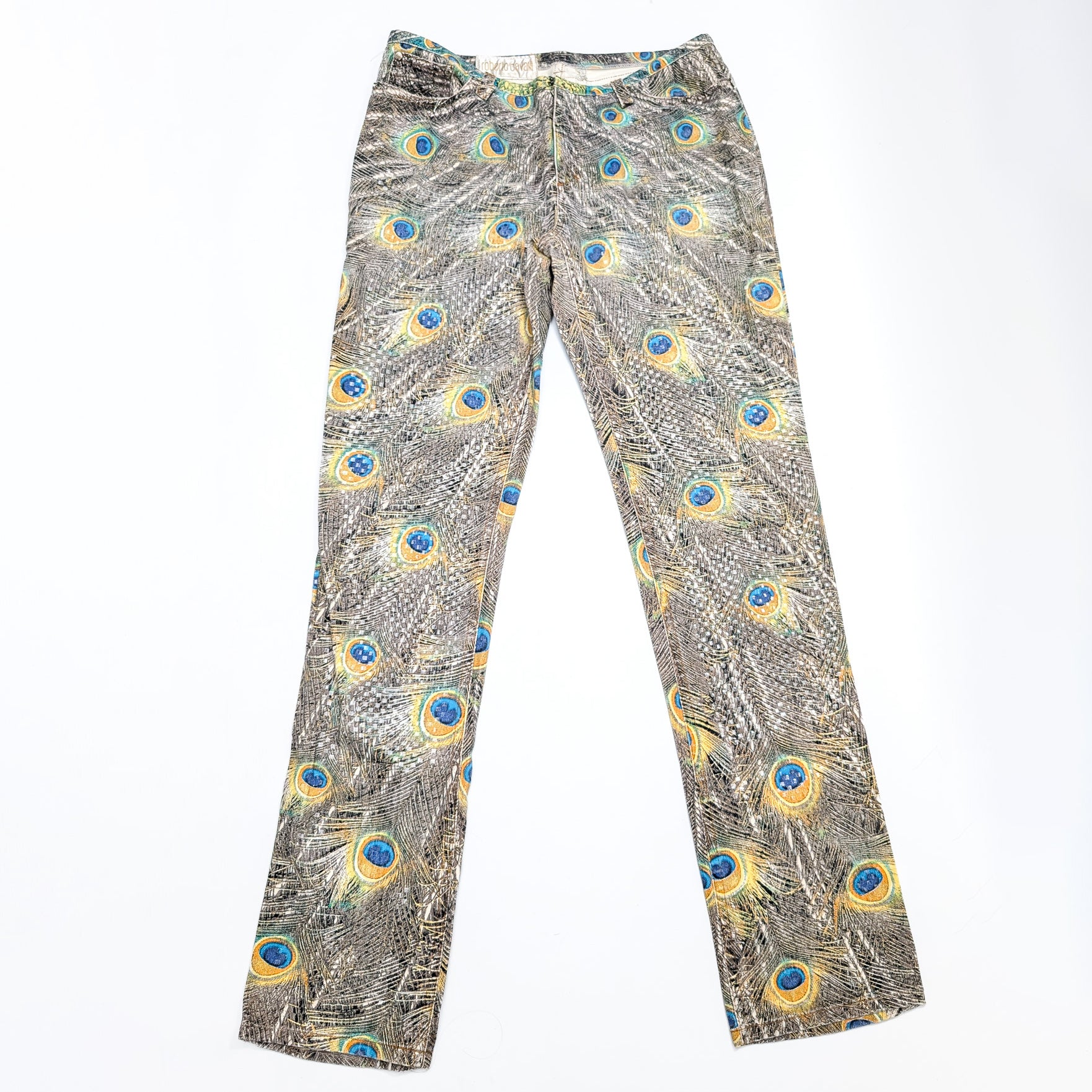 Item: Set consisting of low-rise denim pants adorned with rhinestones and a cotton shirt featuring a peacock pattern.