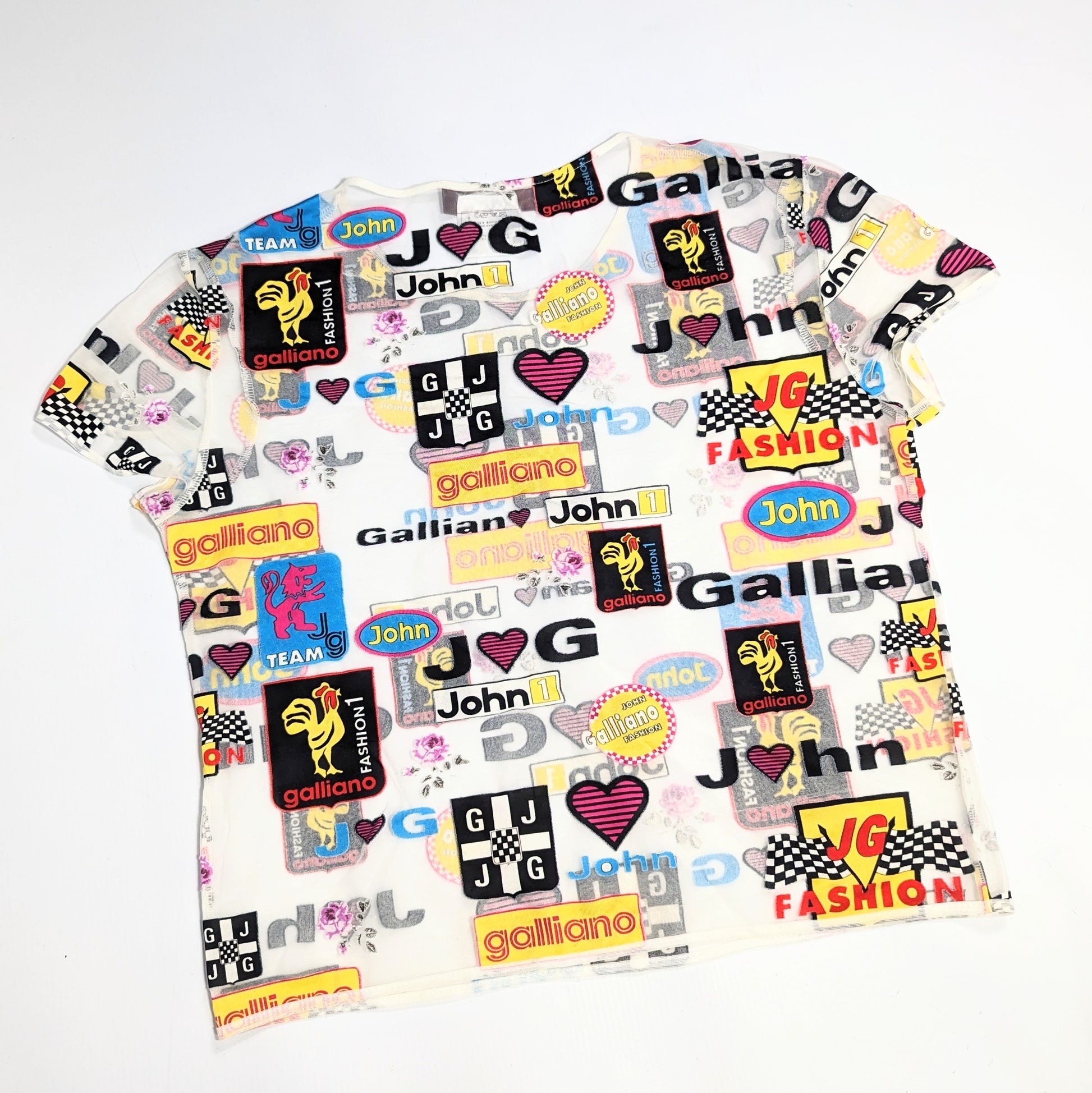 Item: Round neck T-shirt with "racing motorcycle" style monogram print with multiple "I love John Galliano" inscriptions. Transparent mesh material.
