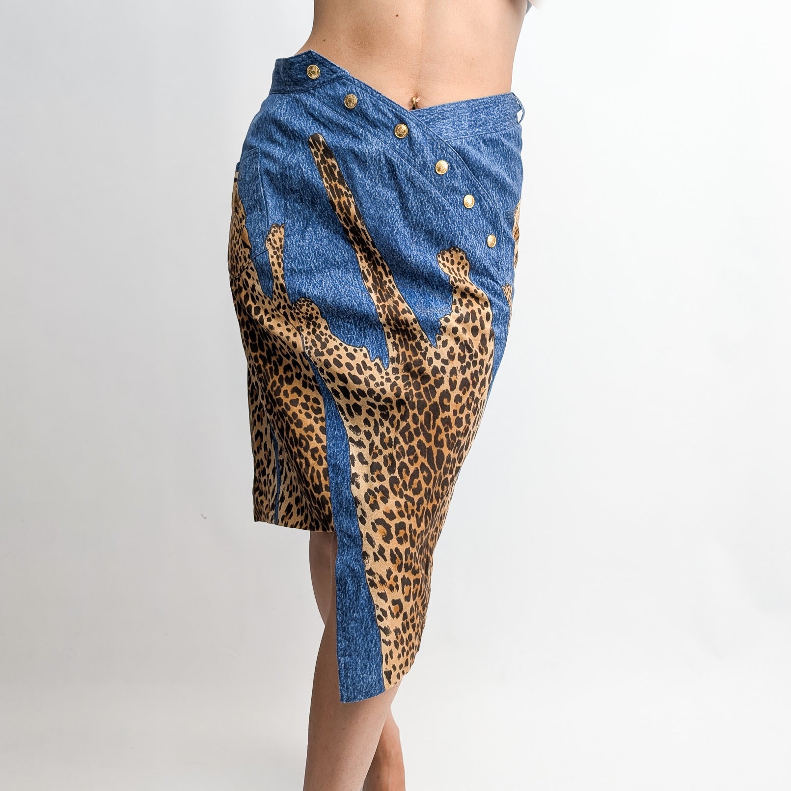 Item: Lightweight denim skirt with faux leopard print. Asymmetrical. Can also be worn as a bandeau dress.