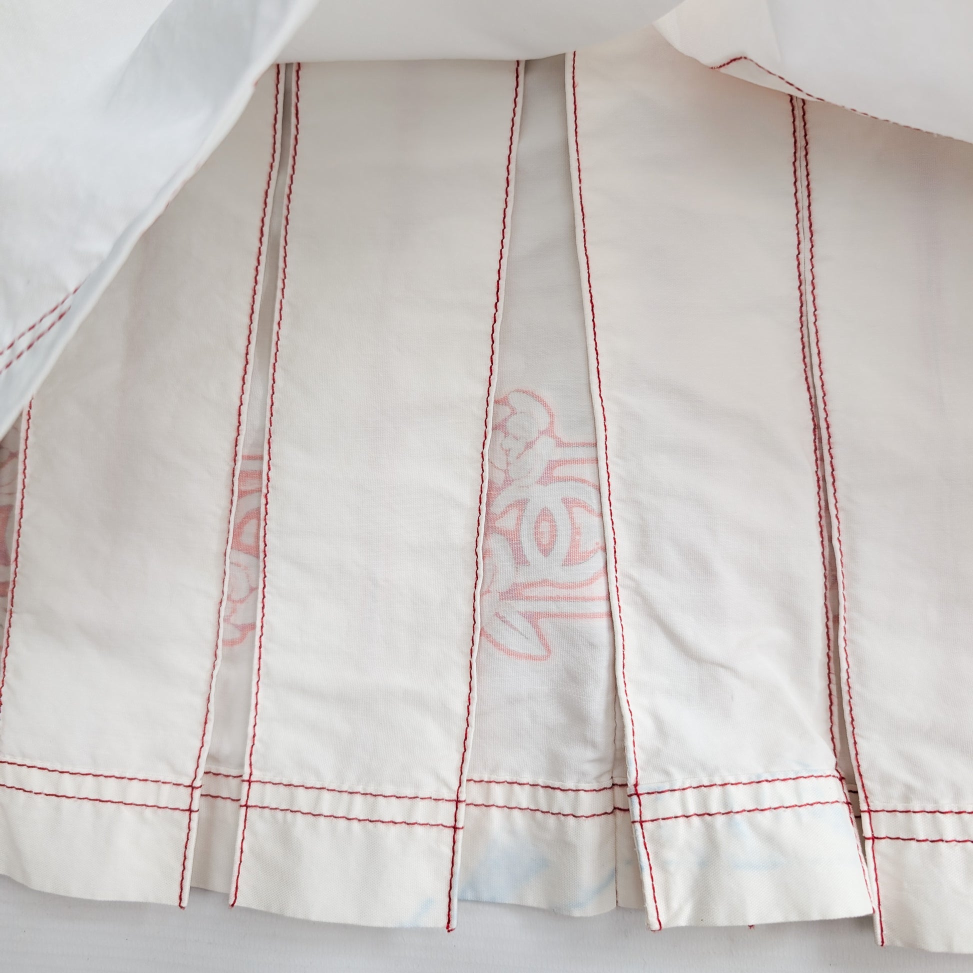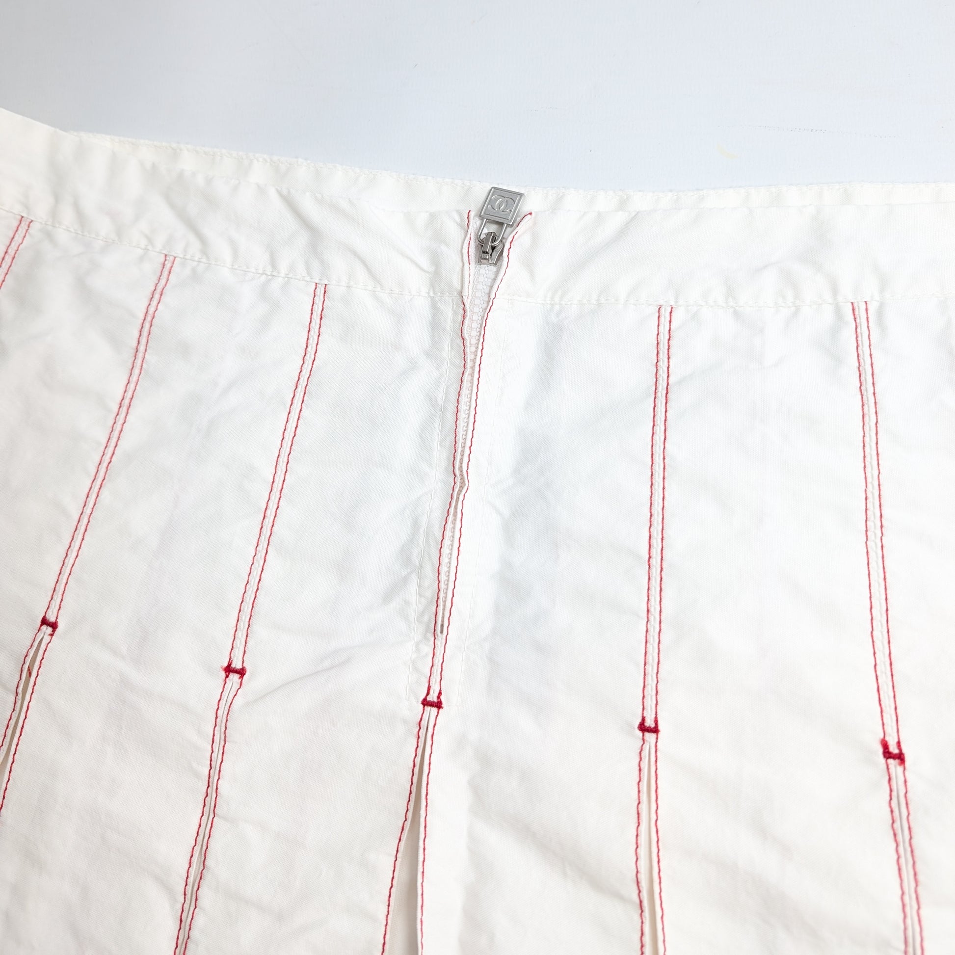 Item: Chanel pleated mini-skirt adorned with the Chanel logo.