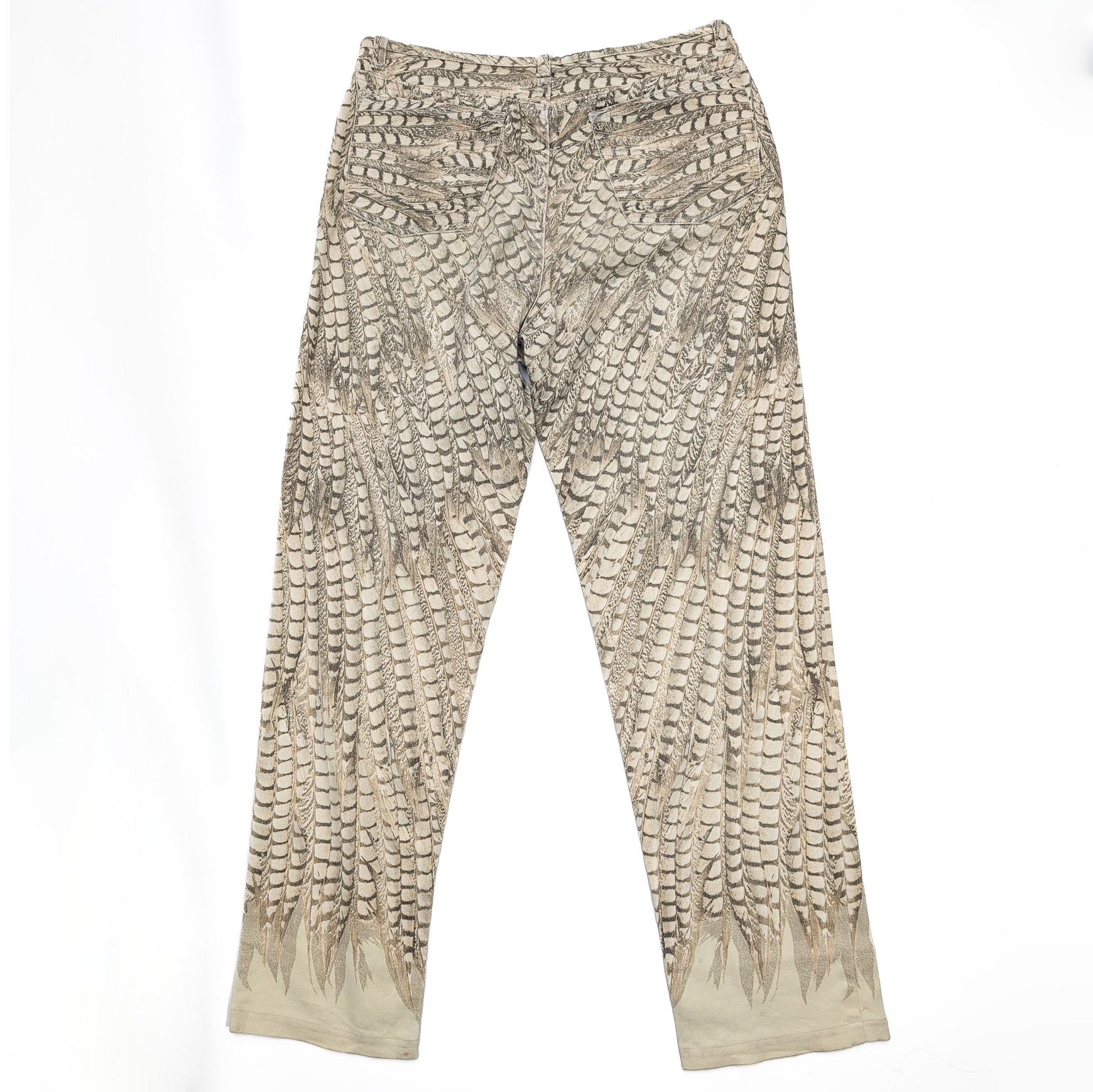 Item: Roberto Cavalli low-waisted pants with feather pattern.