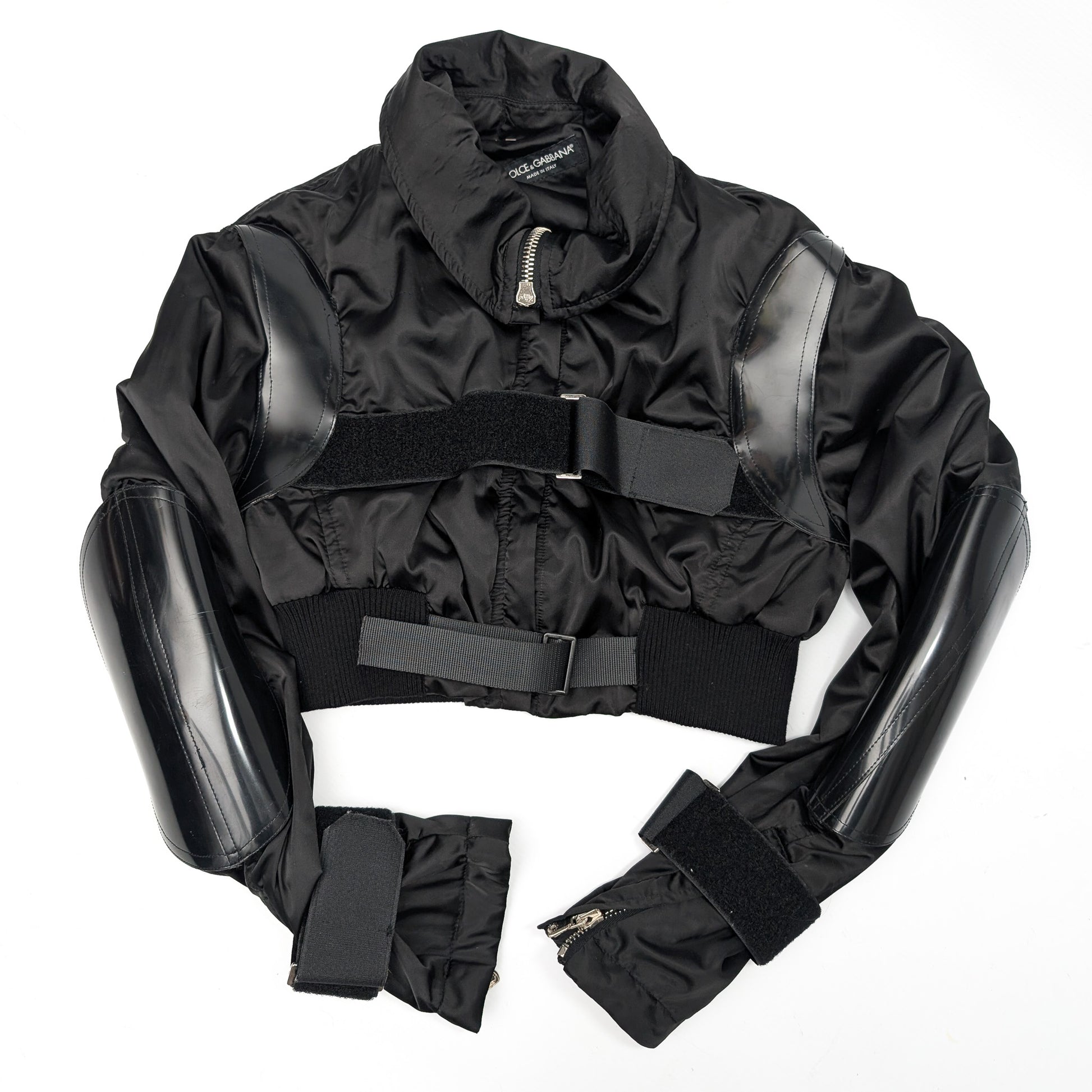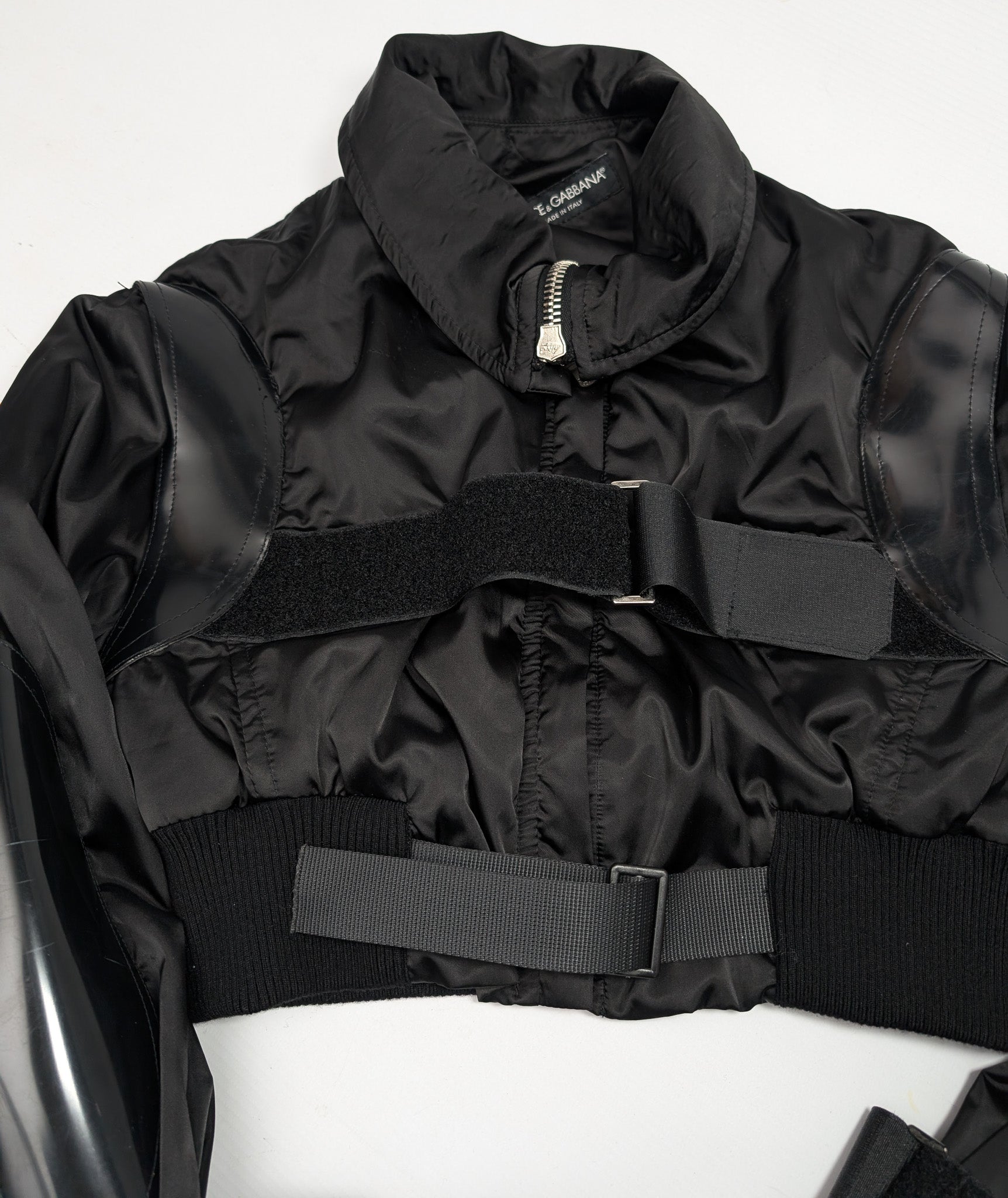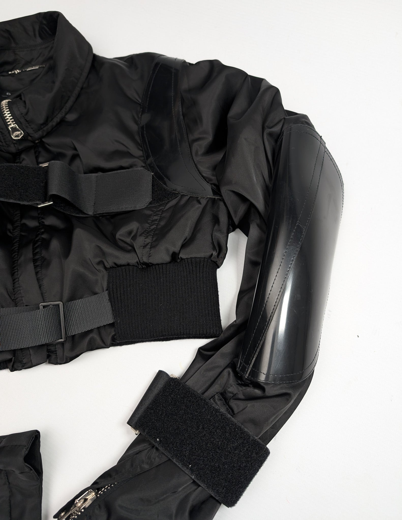 Item: Short black jacket in nylon and PVC. Details include buckle and Velcro straps, PVC elbow patches, and a front zipper.