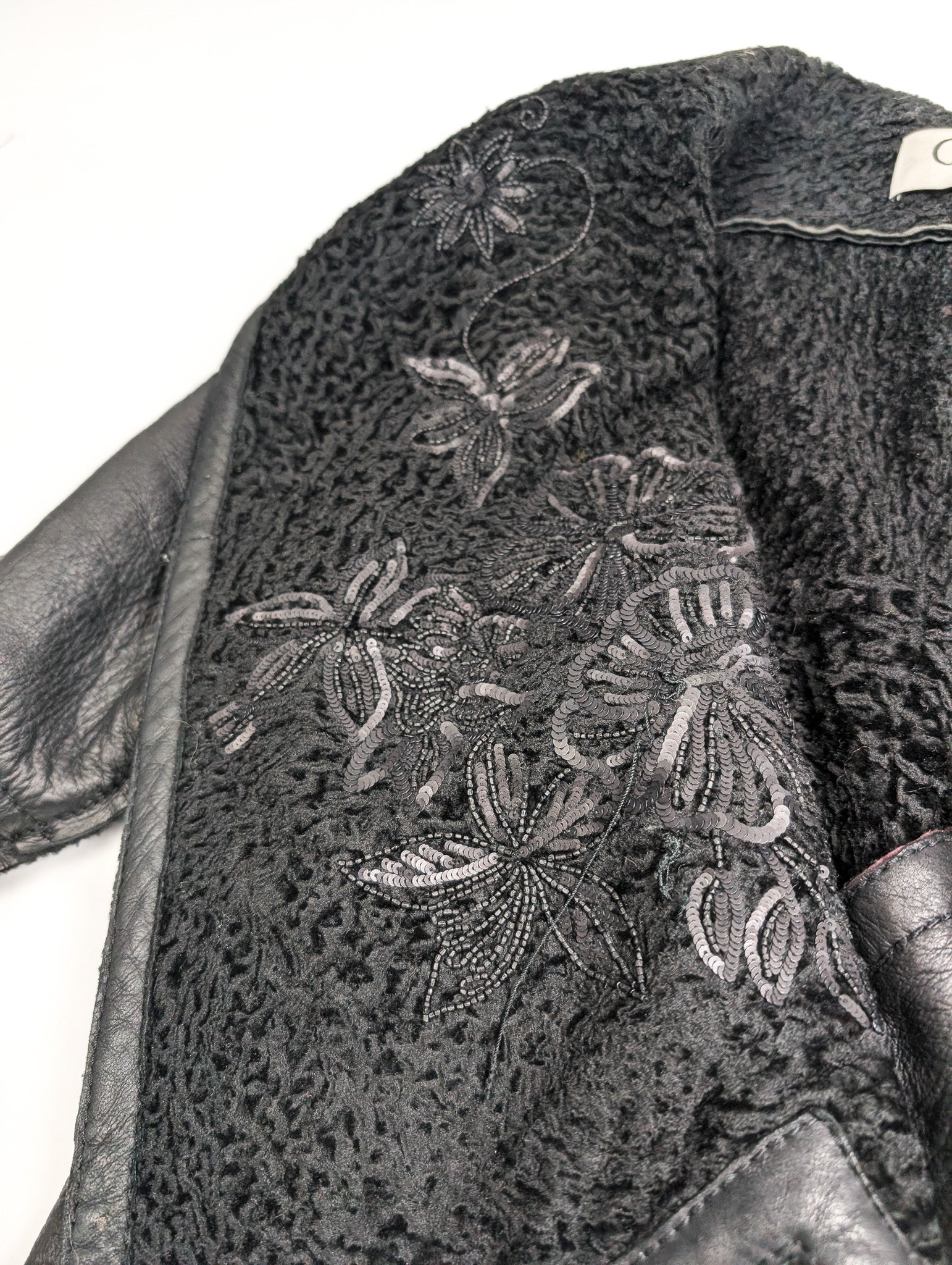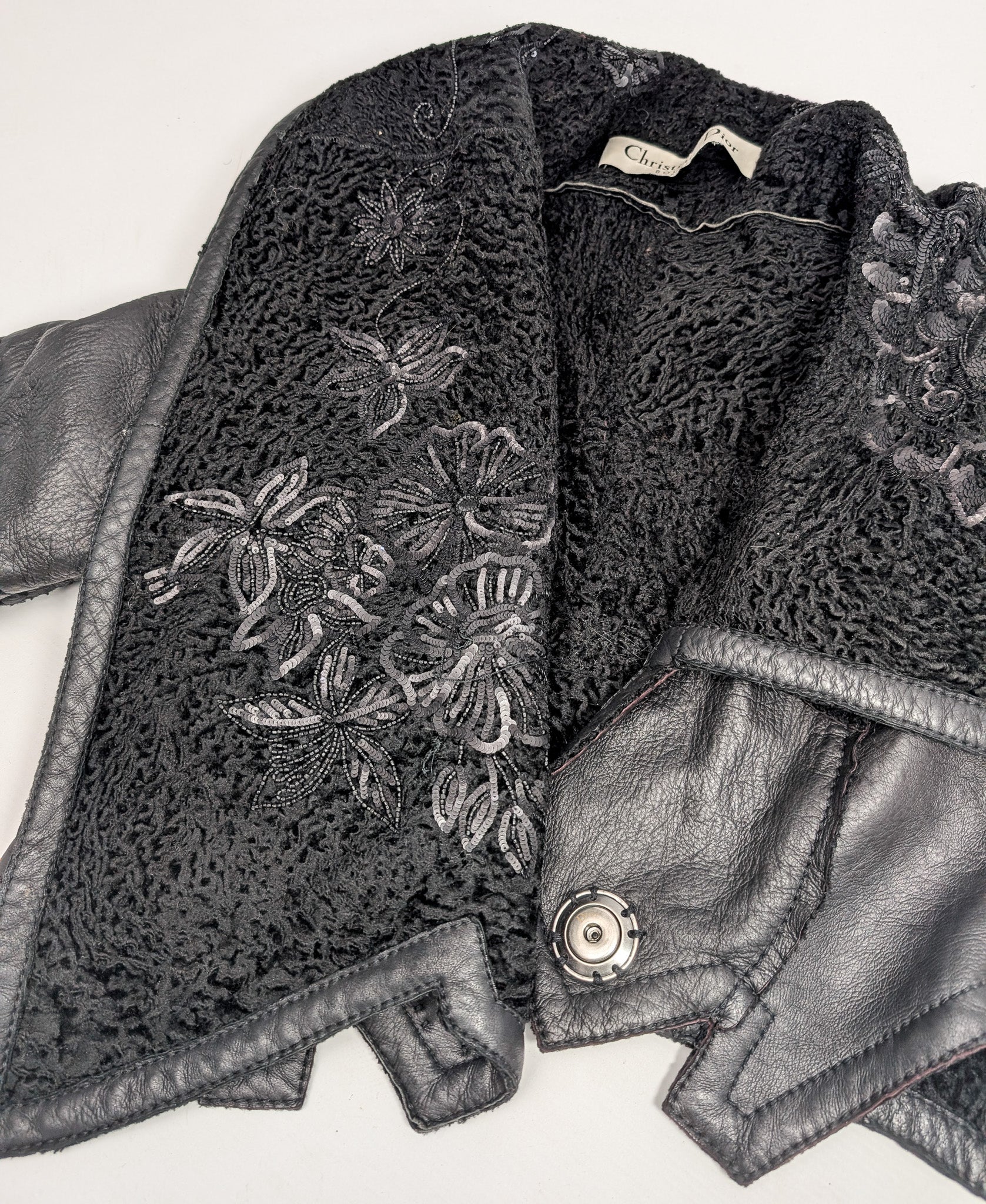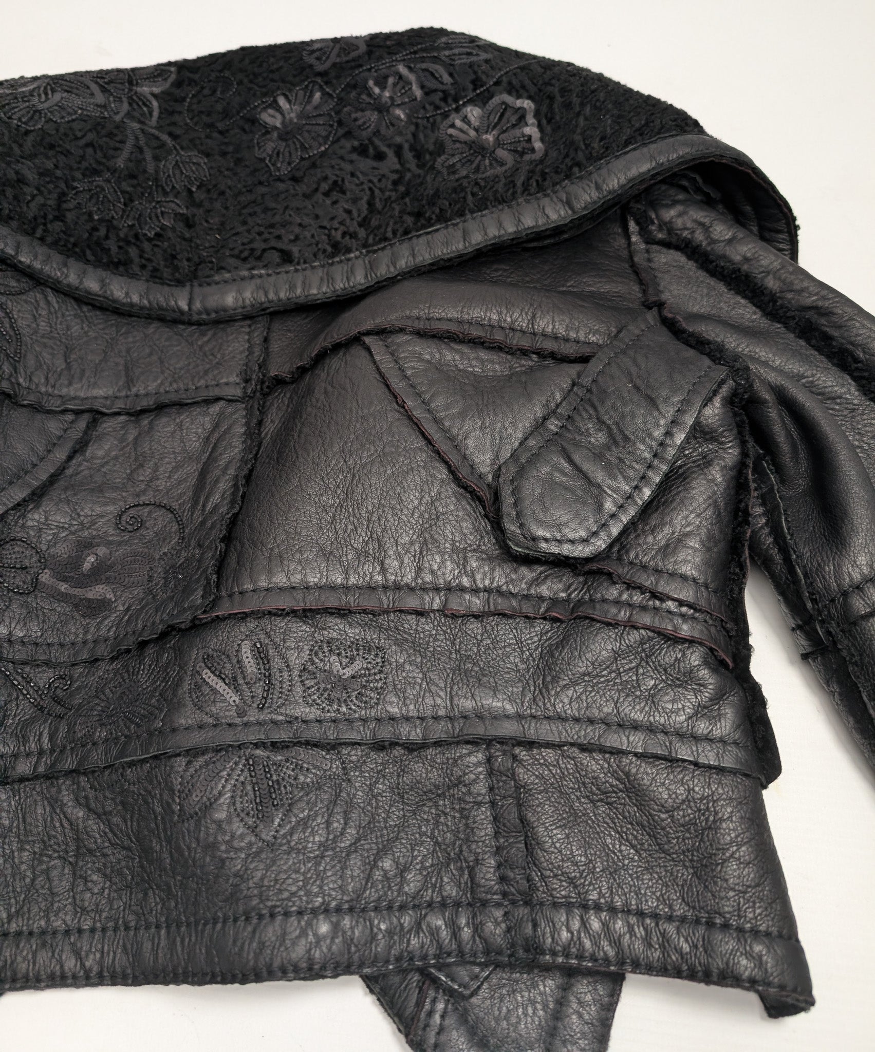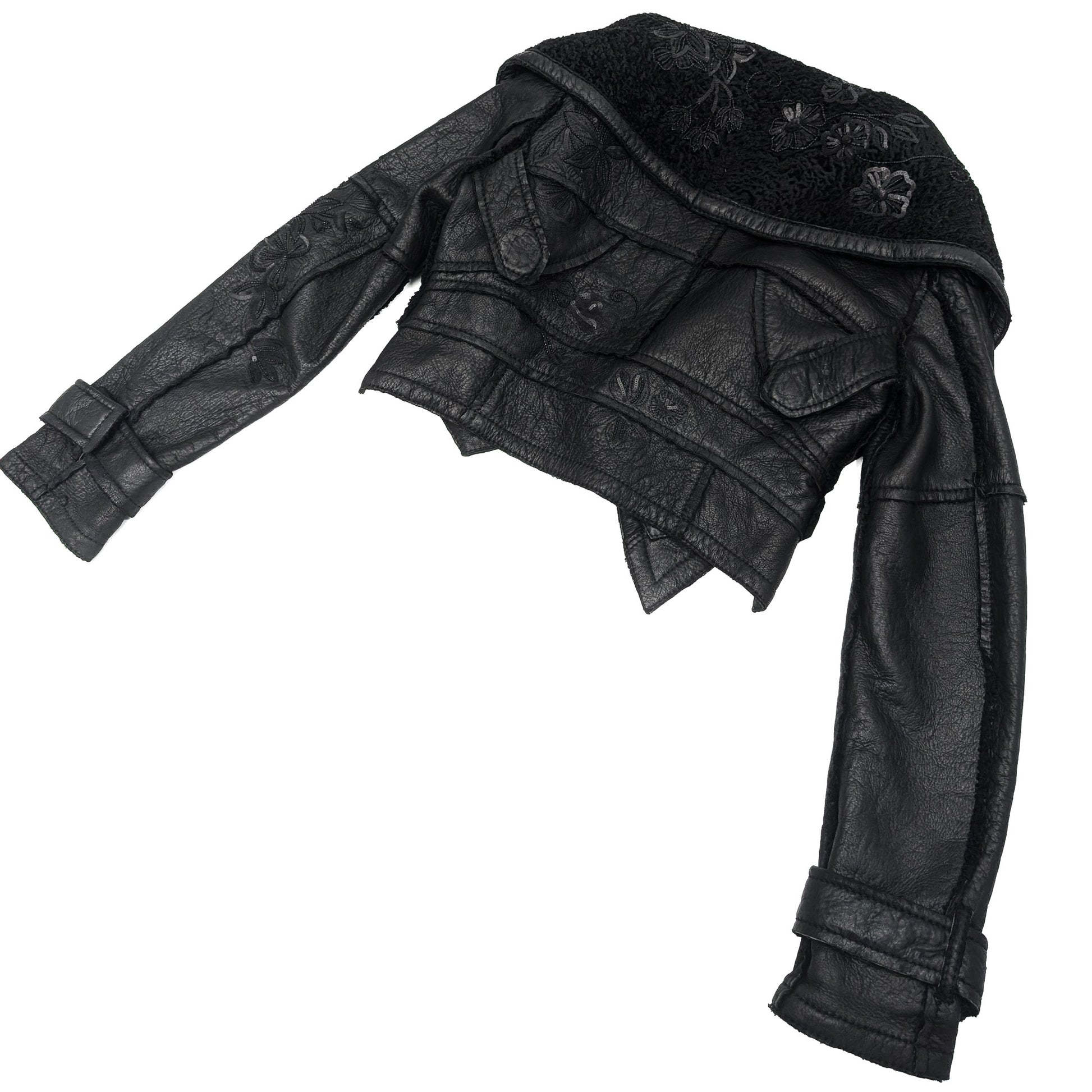 Item: Black rhinestone-embellished suede jacket with a low neckline.